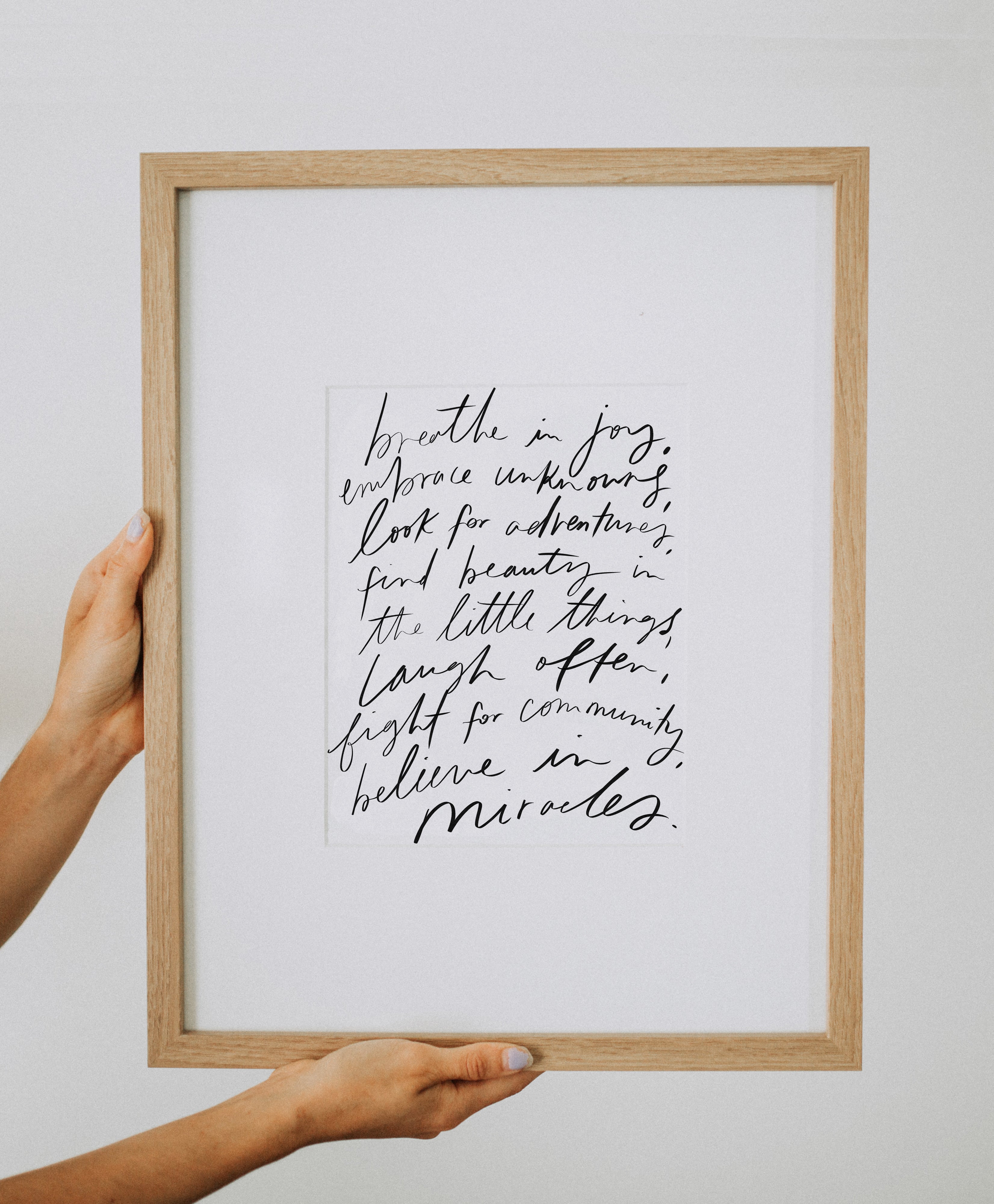 "Breathe in joy, embrace unknowns, look for adventures, find beauty in the little things, laugh often, fight for community, believe in miracles"