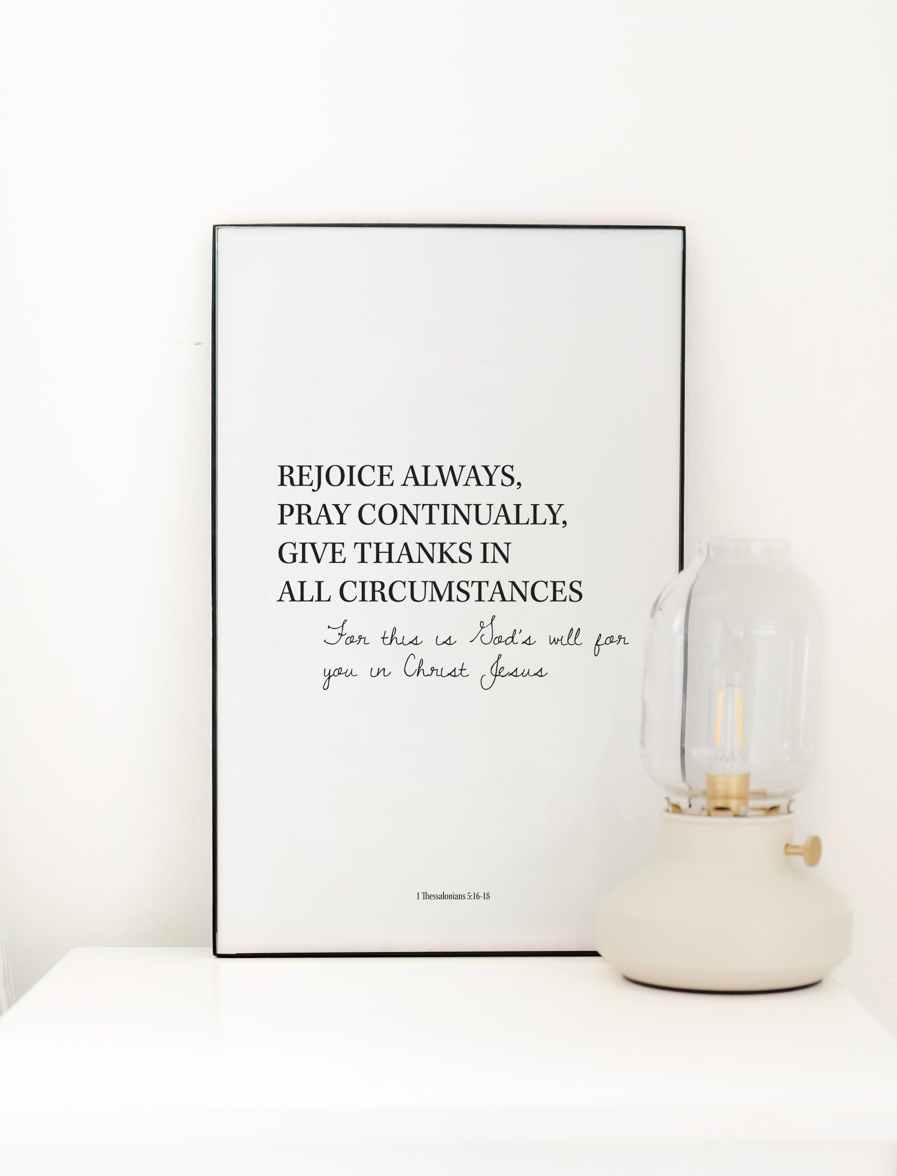 "Rejoice always, pray continually, give thanks in all circumstances for this is God's will for you in Christ Jesus" 1 Thessalonians 5:16-18