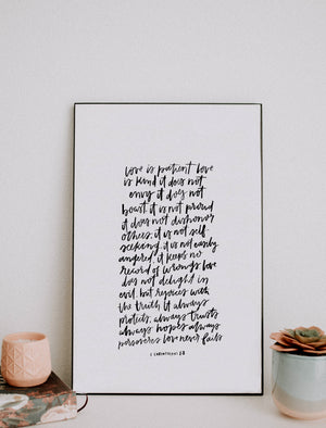 "Love is patient love is kind it does not boast, it is not proud it does not dishonor others, it is not self seeking, it is not easily angered, it keeps no record of wrongs. Love does not delight in evil, but rejoices with the truth it always protects, always trusts always hopes always perseveres love never fails 1 Corinthians 13"