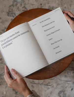 Create a keepsake your grandchild will treasure forever with the For My Grandchild journal. Thoughtfully designed with guided prompts and plenty of space to write letters, this heirloom journal helps grandparents share stories, wisdom, memories, and encouragement that will last for generations.