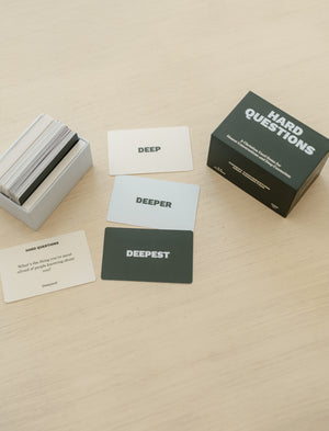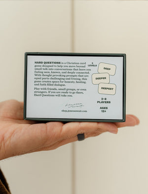 Hard Questions is a Christian card game designed to help you move beyond small talk and into conversations that leave you feeling seen, known, and deeply connected. With three intentional levels: Deep, Deeper, and Deepest, this game meets you where you are and invites you to go further when you’re ready.
