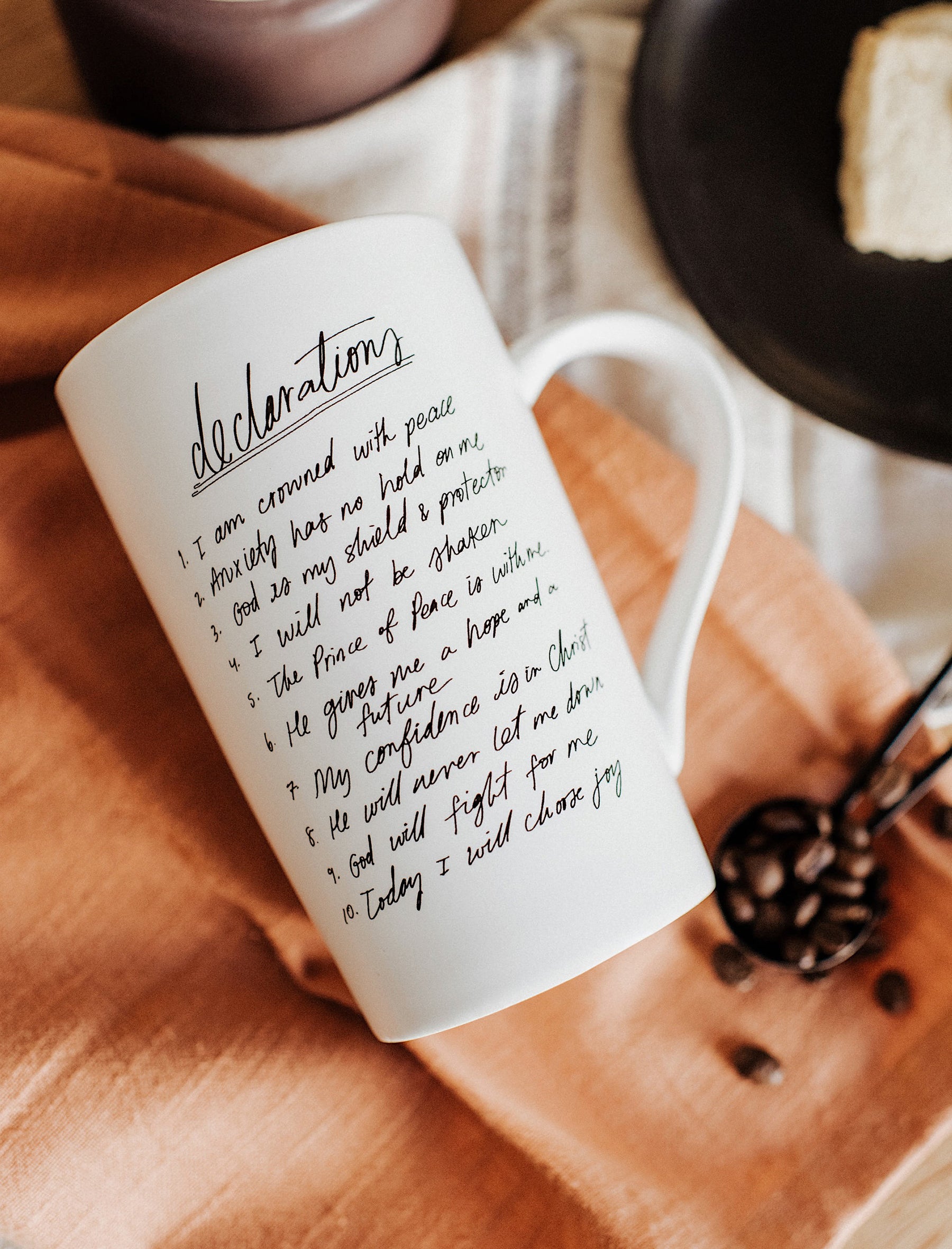 "1) I am crowned with peace 2)Anxiety has no hold on me 3) God is my shield and my protector 4) I will not be shaken 5) The Prince of peace is with me 6) He gives me a hope and a future 7) My confidence is in Christ 8) He will never let me down 9) God will fight for me 10) Today I will choose joy"